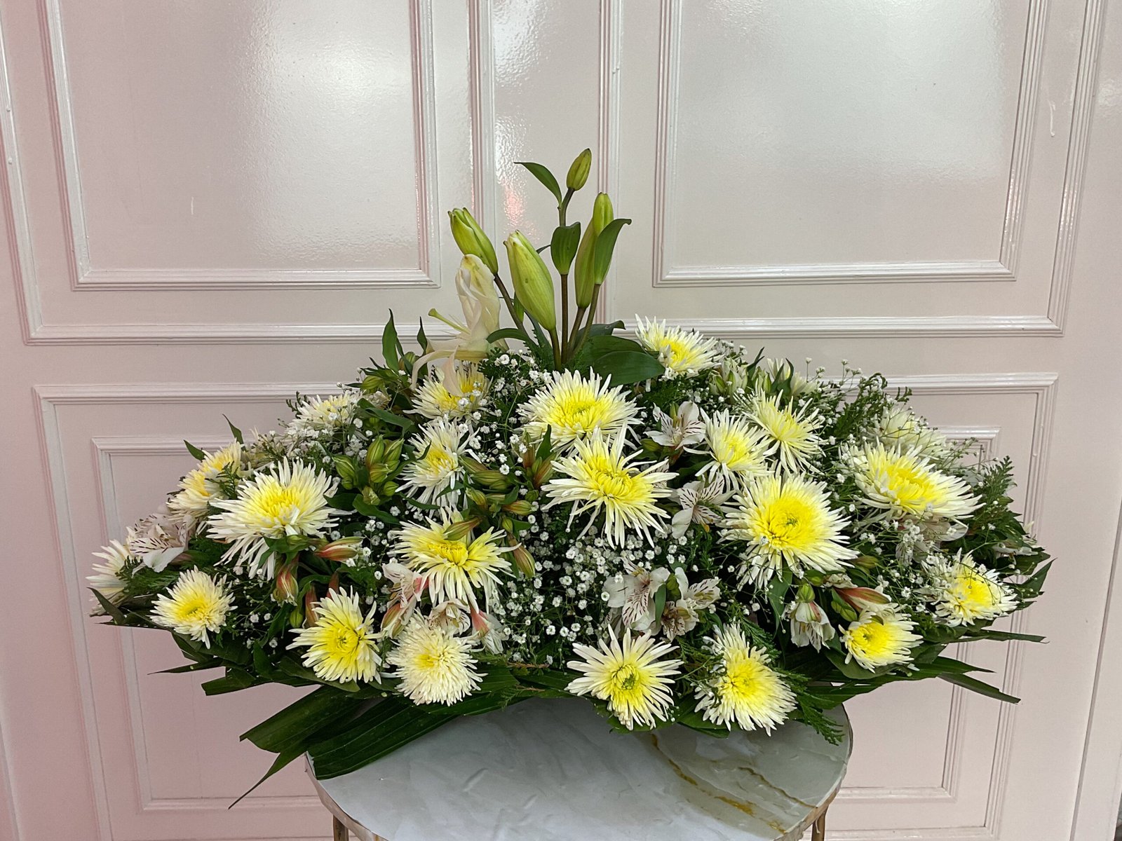 Palma funebre con chena, lilis y gypsophila blanca o astromelia blanca